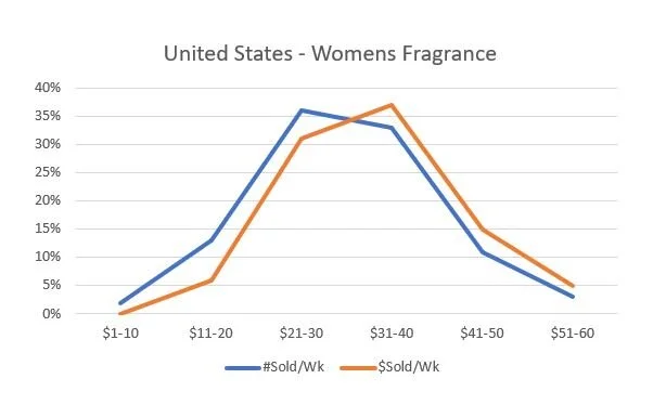 Overall fragrance sales are saturated in the $20-40 range, making nearly 70% of total sales and revenue.