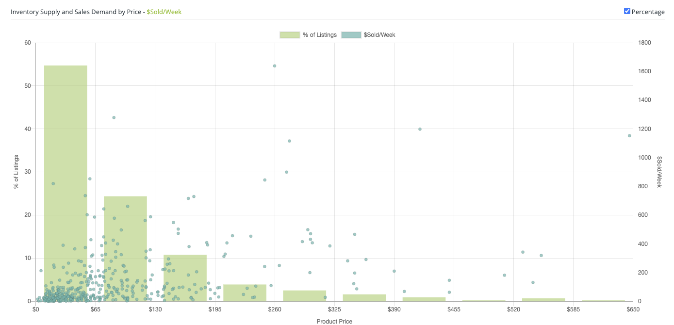 There are a few listings at higher price points with relatively high weekly sales, suggesting that while they are less common, they can generate significant revenue.